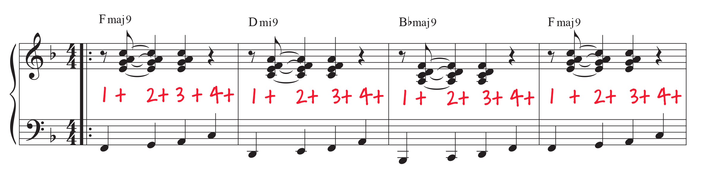 It’s time to get really jazzy! You may know that jazz is all about that swing. Our final ingredient is a simple swing comping rhythm.