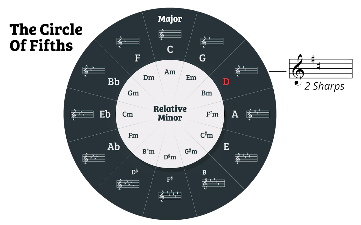 If you follow the clock along, you’ll see the next key is a fifth above: G major. G major contains just one sharp. F#. If you continue along the clock, you’ll move up another fifth interval, this time landing on D. The key of D major has two sharps, keeping the F# from G major and adding C#.