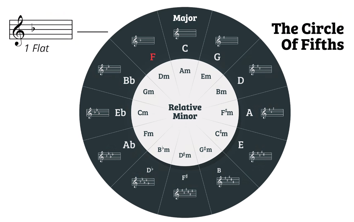 You can also read the Circle Of Fifths in the other direction too. If you go back to C major, and this time move one to the left, you’ll get to F major, a fifth interval down from C. If you move down the left side of the Circle Of Fifths, it will show you the order of added flats rather than sharps.