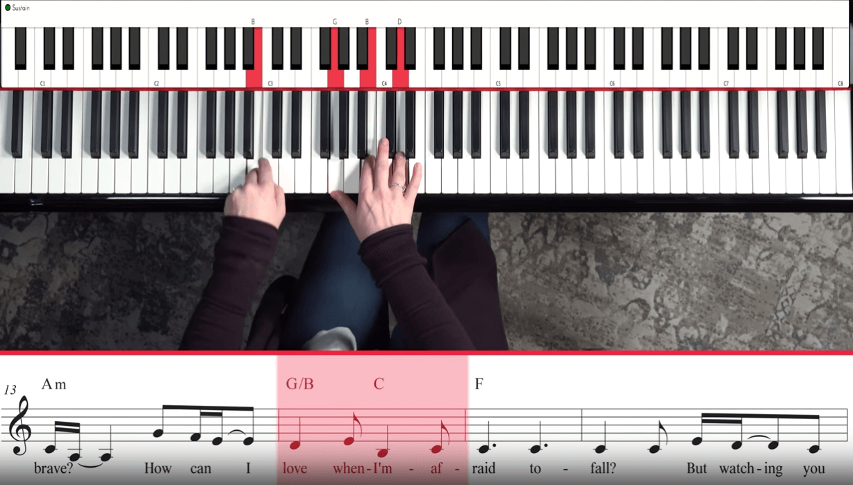 You can see here I’m playing the notes A-B-D#-F# in my right hand. I play that 7th note (A) at the bottom because I have small hands and it’s more comfortable for me that way. If you don’t feel comfortable with playing that A yet, that’s fine. You can stick to just the B major chord.
