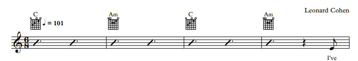 In “Hallelujah”, there is a chord change at the start of each measure. Here’s the first line: