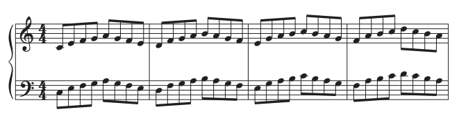 The exercise itself is quite simple. It involves climbing up the keyboard one octave. There is one skip to begin with, but everything else is a simple stepping pattern.