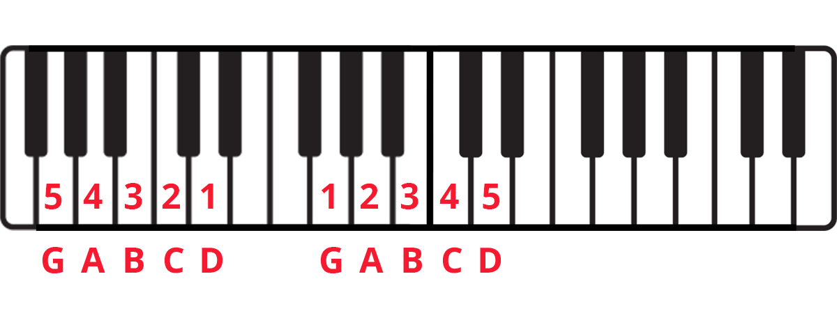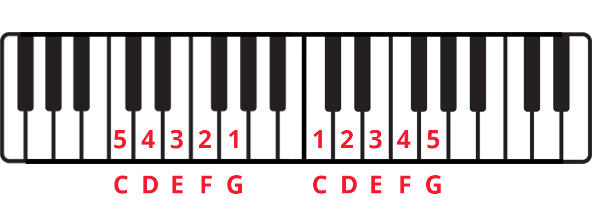 To play the five-note scale, place your right thumb on middle C and your left pinky on the C below that (low C). Then line up the rest of your fingers.
