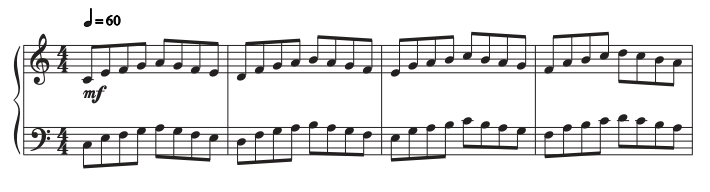 For this example, we’ll use Hanon #1. I love Hanon exercises for warmups because they also help build a bunch of other crucial skills, like finger and hand independence, control, speed, etc.