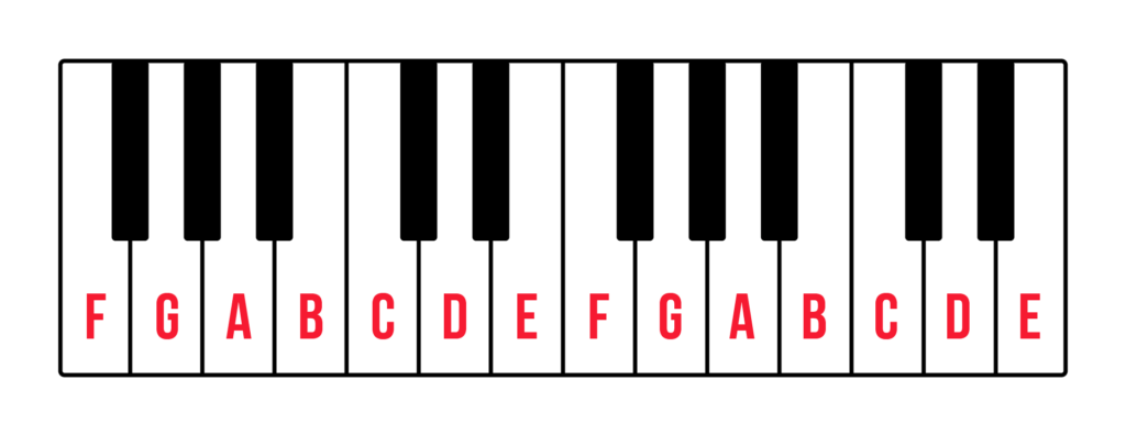 First, let’s learn how to find our way around the keyboard. Find a set of two black keys and play the white key to the bottom left of them. That’s C. Now play all the white keys until you reach the next set of two black keys and hit the white key on the bottom left. You’ve just played an octave from C to C. The names of these notes are C-D-E-F-G-A-B-C. You can also remember that the white key to the bottom-left of the set of black keys is F.