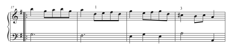 Middle C is one example of a ledger line, but the more common examples are found ABOVE the treble clef. Let’s take this section of “Minuet in G”: