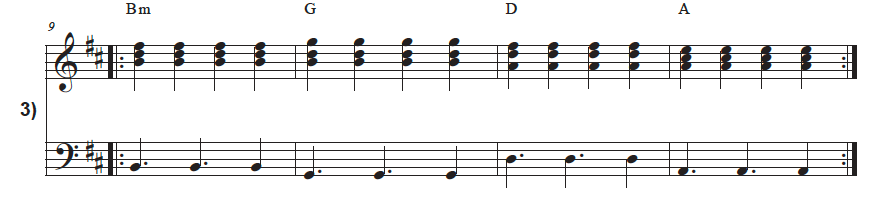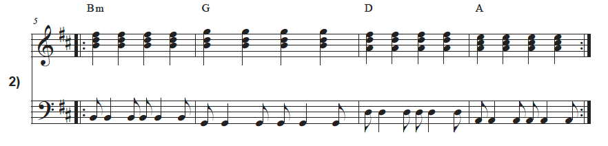 This is an expansion of Exercise # 1, and it helps to know that the right-hand stays exactly the same. There is no change. There is only a slight change to the left-hand rhythm in the middle of each measure. But the start and end of each bar are still the same: