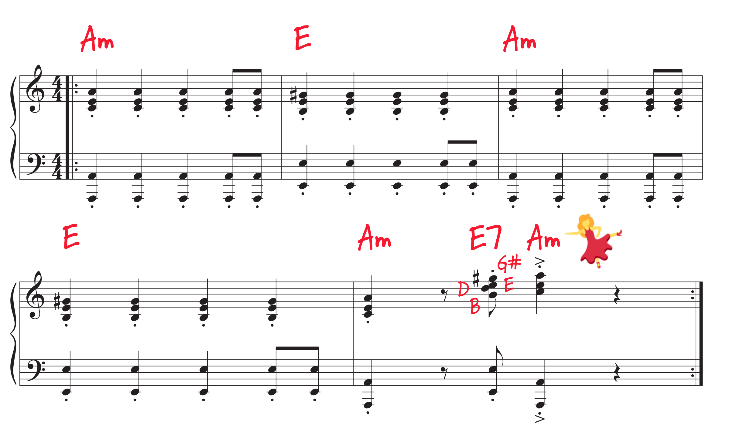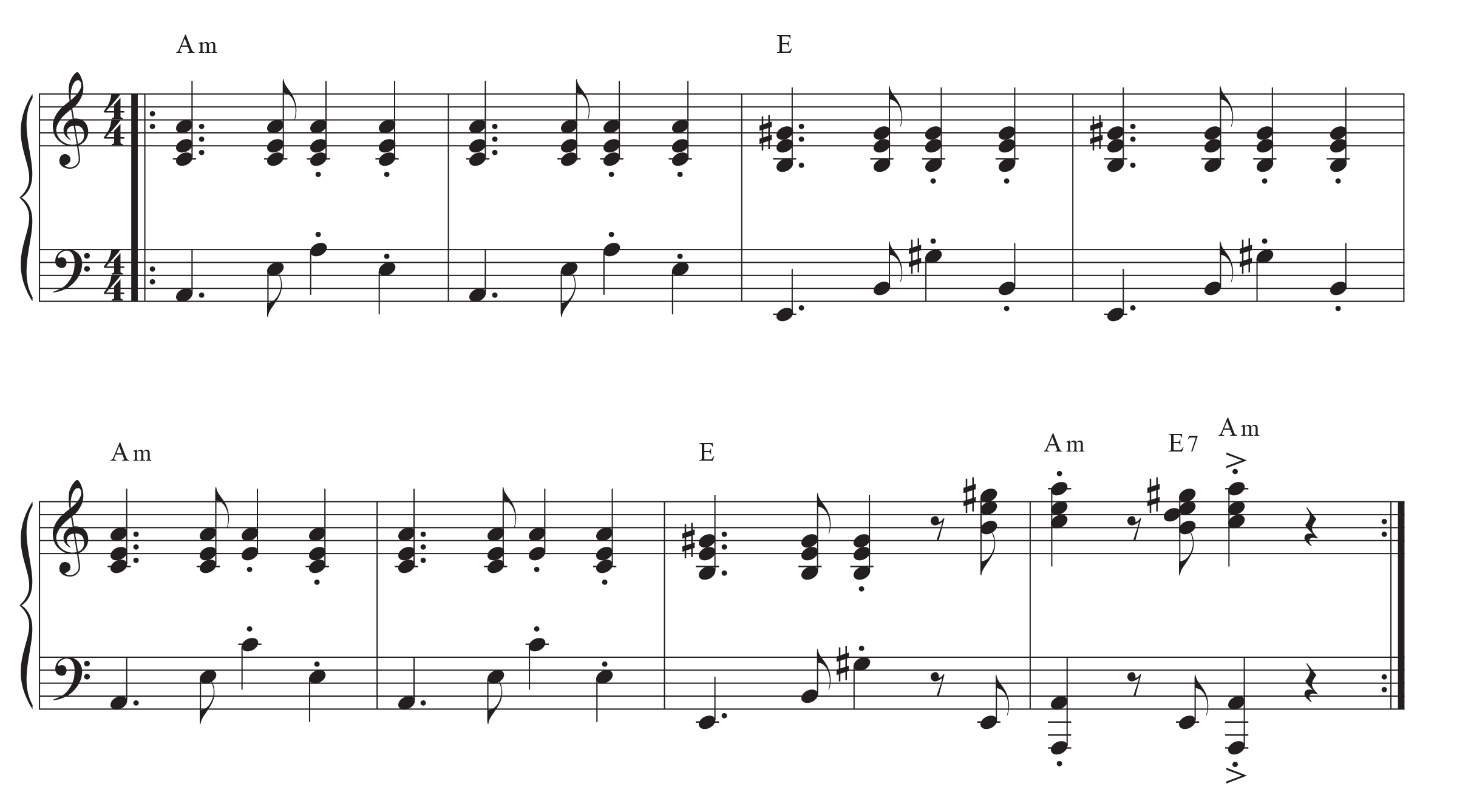 For this rhythm, we’ll outline a chord using octaves and fifths: