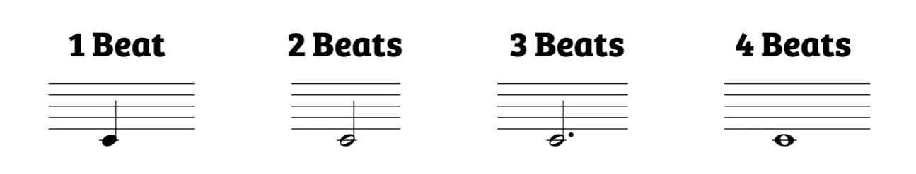 The next bar contains both quarter notes and half notes. The first two notes are quarter notes while the third note is a half note, which means it’s held for a count of two beats (or half the measure). With the third bar you again have four simple quarter note, while the fourth bar has only one whole note, which is held for the entirety of the bar.