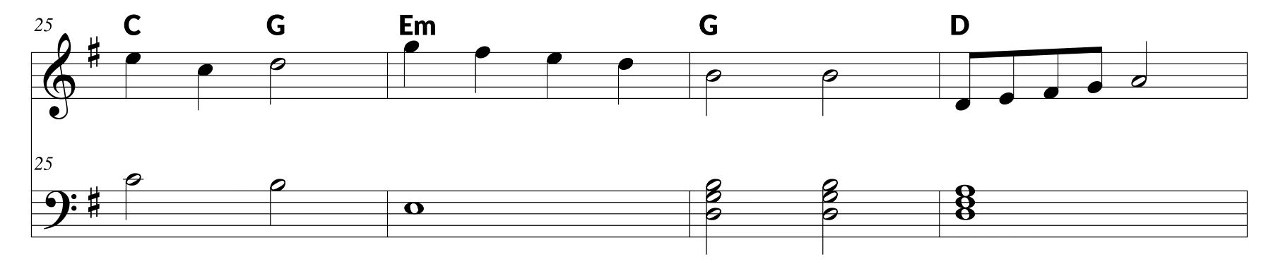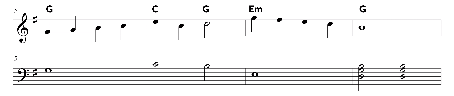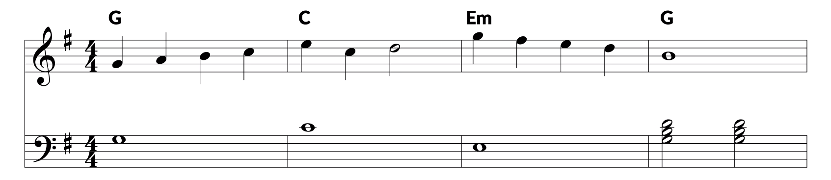 Now let’s take a look at the left hand notation. Remembering that phrase ‘All Cows Eat Grass’ helps you remember the order of space notes counting up in the bass clef, you’ll find that the whole note in bar one is G. The next note should be pretty familiar by now. It’s Middle C. the top note in bar three is an E, while the two chords in bar four are G major triads. All triads in their root position will look like these chords. It simply means that you’re building a chord by skipping a note in between each key played.