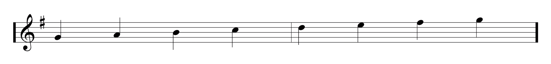 The next bar has a jump up to the G note sitting at the top of the staff, and then it walks down in 2nd interval steps (again, notice how the notes move from space note to line notes). The 4th bar only has one note, which is another lined note, indicating that you jump over a key to land on it.