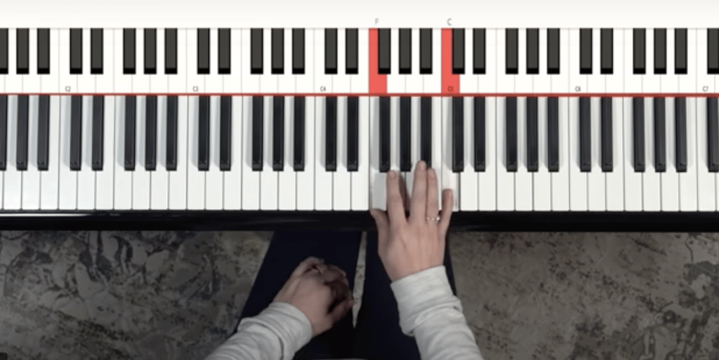 Once you’ve found F, count up 5 white notes. That’s C. Those are the two notes you’ll be playing. They look like this: