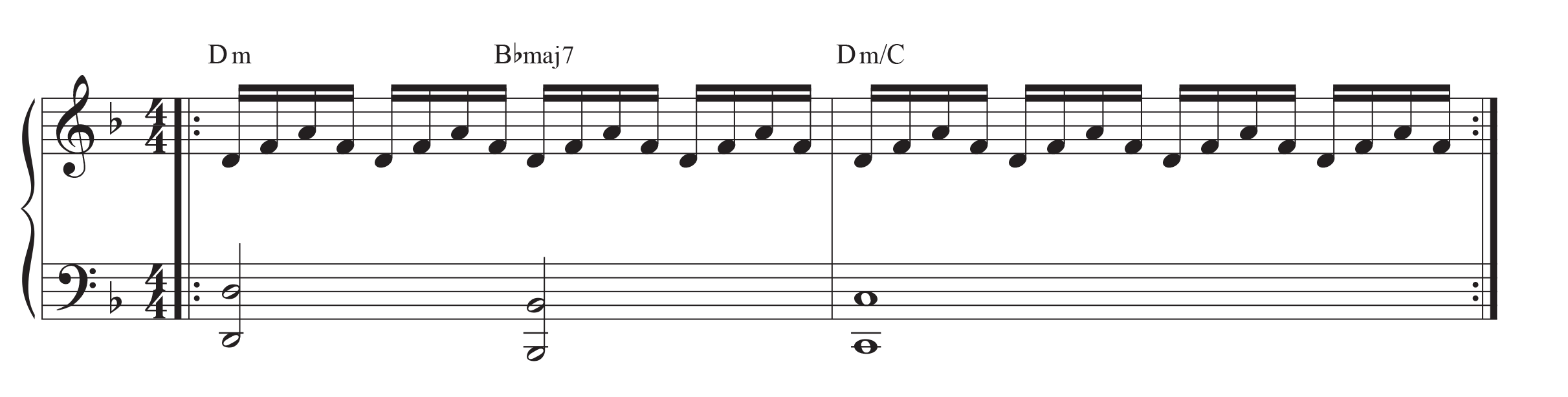 As you can see, these chords are very similar to each other. In our exercise, we’ll play them across both hands. Which means, essentially, you’ll play the same Dm triad in your right hand.